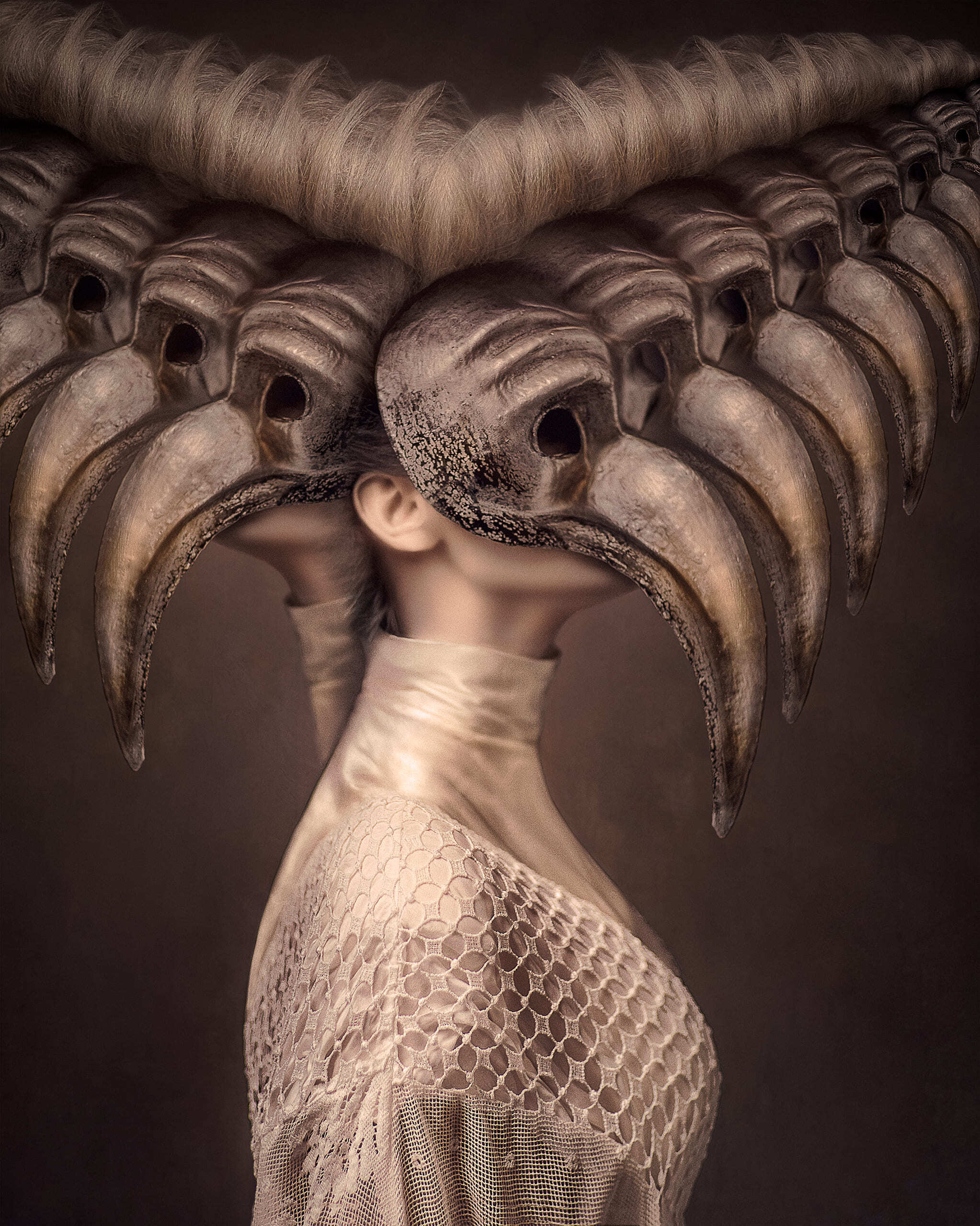 This artwork, titled "Archetypus," explores the theme of "Repetition and a Return to the Archetypal," featuring multiple depictions of a woman wearing a bird mask, symbolizing humanity's inherent desires. The piece articulates the necessity of a logical structure underpinning art and civilization. In this narrative, logic serves merely as a restraint on the senses, initiating a perpetual cycle akin to reflections in facing mirrors—endlessly looping within nested structures. This unending cycle may represent the construction of human history, culture, warfare, and conflicts, extending even to the cosmos itself.